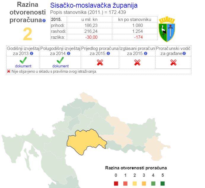 Prema istraživanju Javnog instituta za financije (http://www.ijf.hr/upload/files/file/newsletter/97.pdf) županije su više otvorene od lokalnih samouprava, u transparentnosti su se značajno popravile od prethodnog ciklusa istraživanja. Na žalost, i dalje je izrazito loša Sisačko-moslavačka županija sa samo dva objavljena dokumenta pa se našla na dnu ljestvice jer u vrijeme istraživanja uopće nije objavila proračun za 2015. godinu.