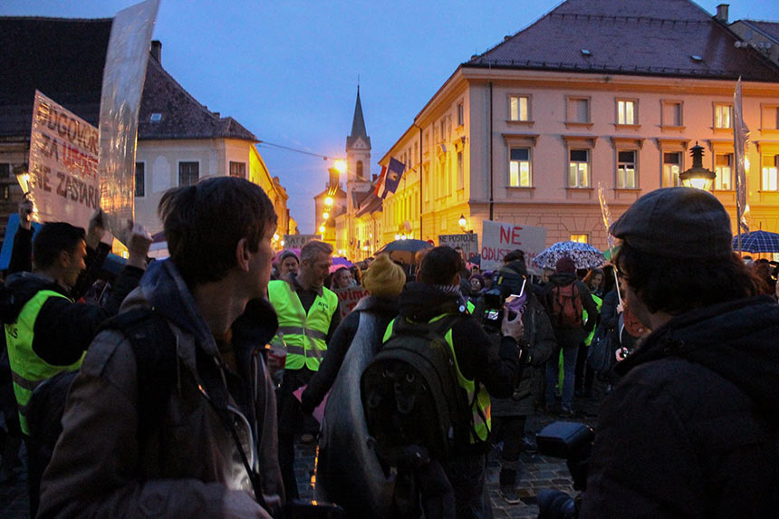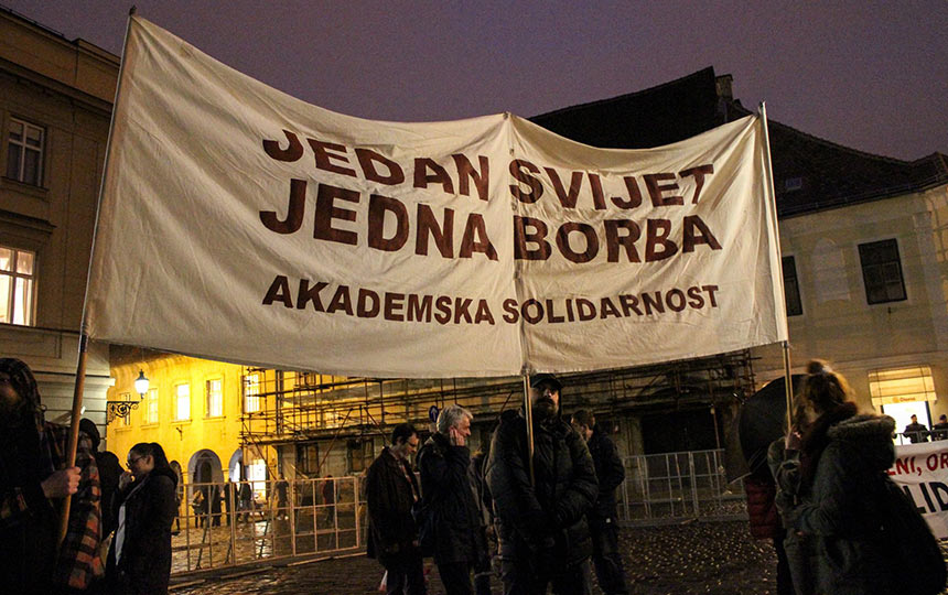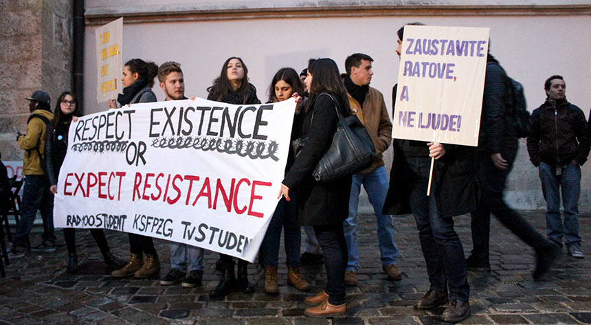 Prosvjednici na Markovom trgu u Zagrebu su hrvatskoj Vladi i vladama zemalja na tzv. balkanskoj ruti te Europskoj uniji poručili da se protive odlukama o zatvaranju granica za izbjeglice jer se time daje zeleno svjetlo krijumčarima i ugrožavaju ljudski životi. Na mirnom smo okupljanju pokazali svoje neslaganje s politikom Hrvatske i EU prema izbjeglicama. Protivimo se odlukama o zatvaranju granica za izbjeglice, ne možemo samo tako gledati tisuće izbjeglica koje spavaju u šatorima u sred blata. Hrvatska zna da rat sa sobom nosi bol, strah, poginule, izbjeglice i prognanike. Baš zato treba biti zemlja otvorenih vrata za ljude koji bježe od rata.